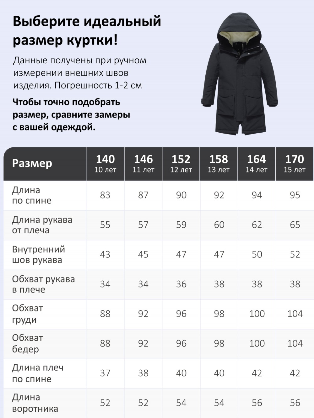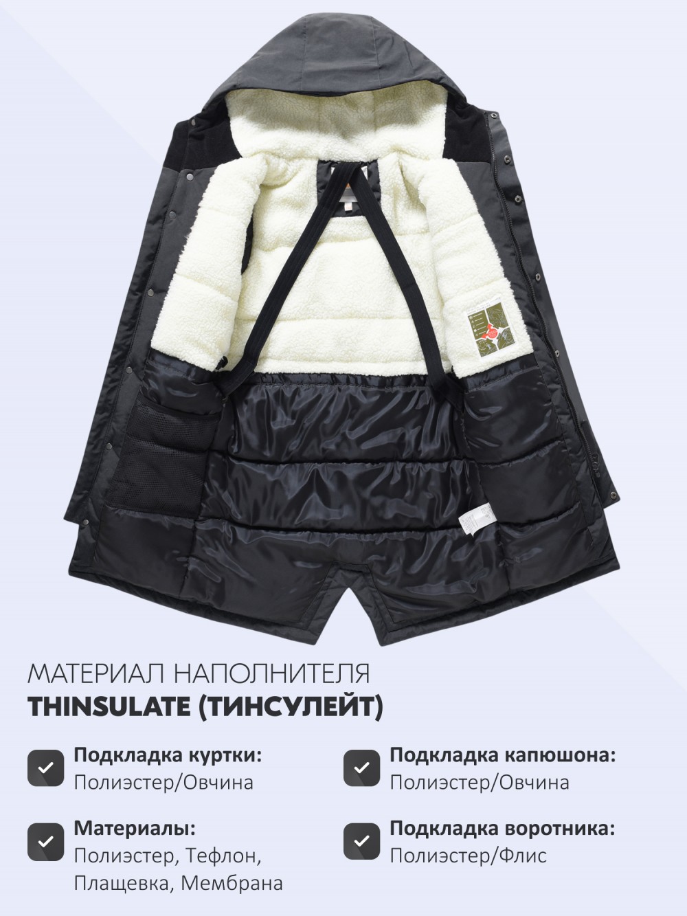 Зимняя парка для мальчика-подростка разработана с учётом всех требований к тёплой и практичной верхней одежде для холодного времени года. Свободный крой до колена обеспечивает удобство и свободу движений, модель одинаково комфортна как для школы, так и для повседневных прогулок. Верх выполнен из плотной износостойкой ткани с водоотталкивающими свойствами, а проклеенные швы надёжно защищают от ветра и влаги, сохраняя тепло внутри. Современный утеплитель тинсулейт с плотностью 280 г/м² поддерживает комфортный температурный режим и позволяет носить парку в диапазоне от +5 до –25 градусов.